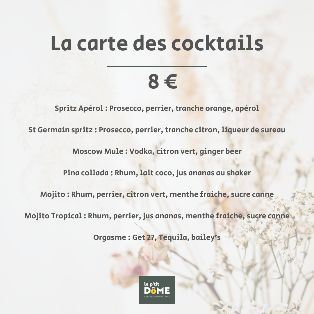 Afin d'accompagner parfaitement vos apéritifs, le P'tit Dôme vous propose une nouvelle carte des cocktails.